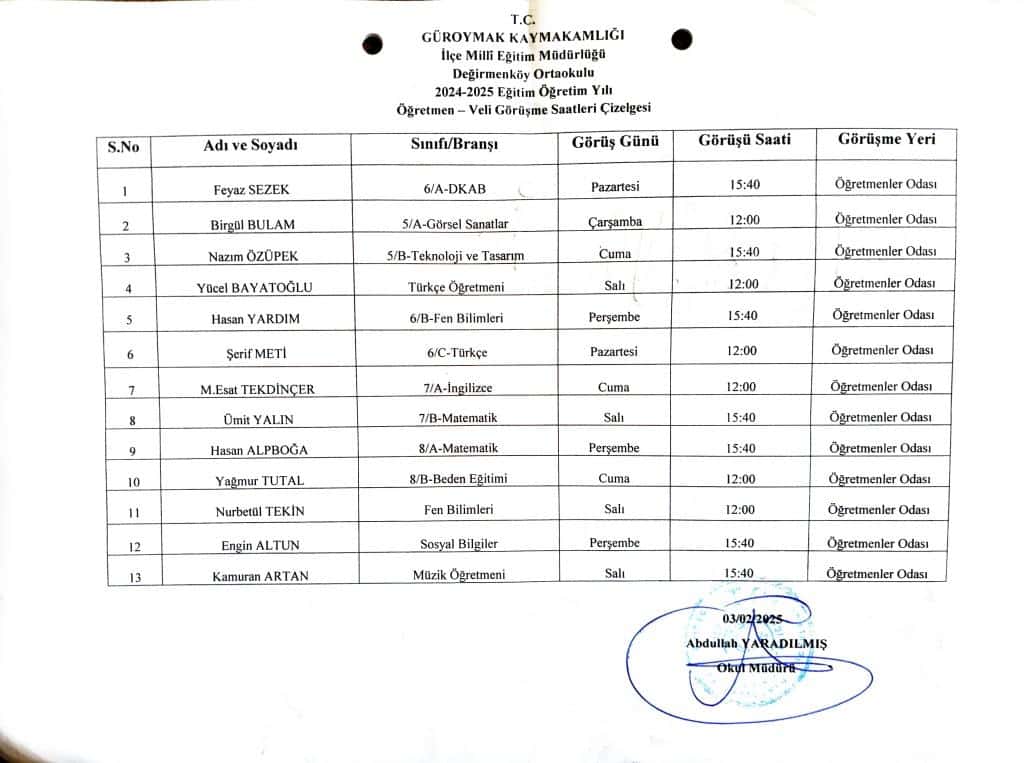 Velilerimizin okul ziyaretleri ve öğretmenlerle görüşmelerinin daha nitelikli, düzenli ve sağlıklı olması için okulumuz tarafından planlamalar yapılmıştır. Velilerimizin Sınıf Rehber Öğretmenlerinden randevu alarak ziyaretlerini gerçekleştirmeleri gerekmektedir.
